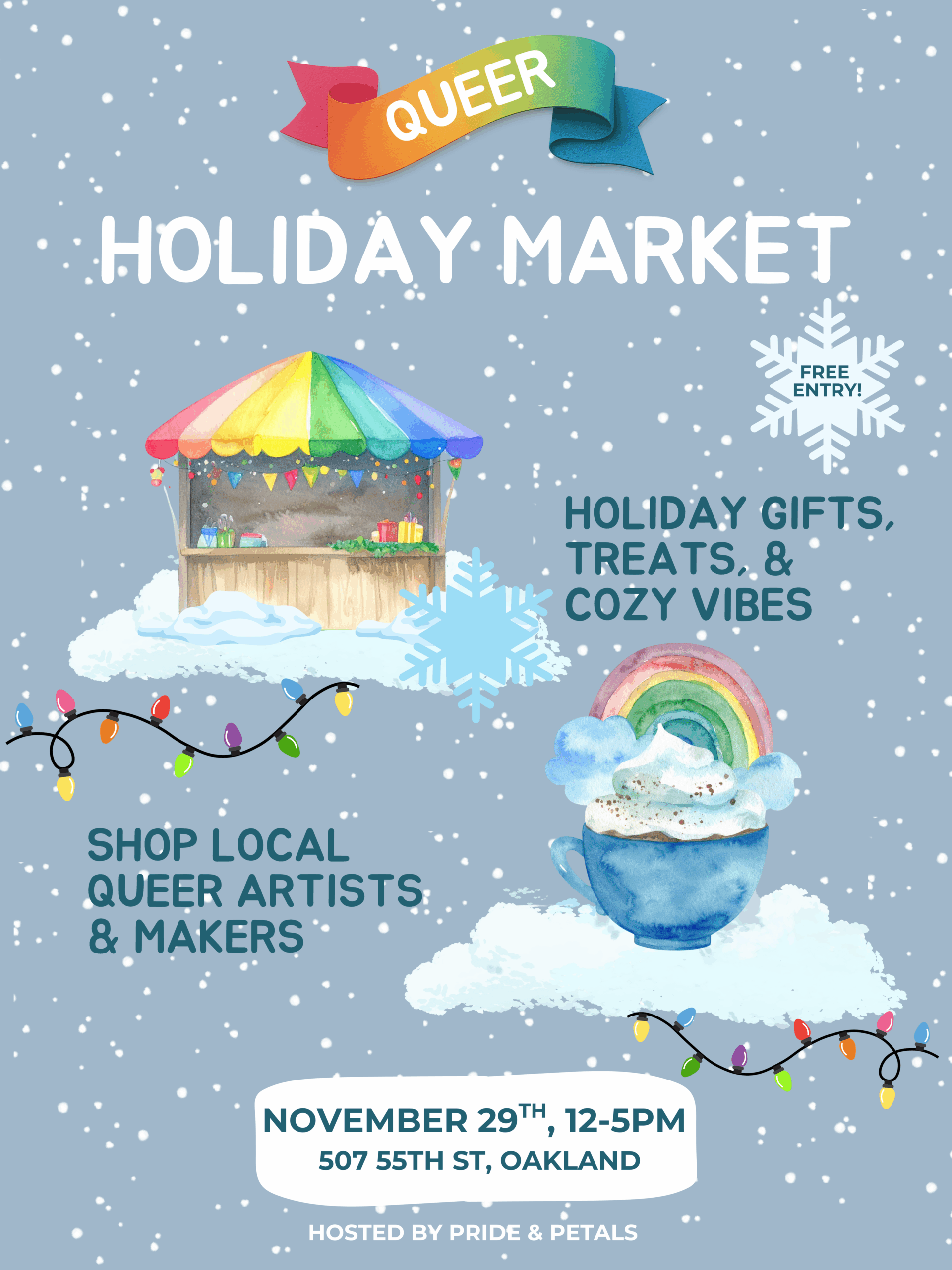 Pride & Petals – the queer neighborhood gift store in Oakland – is hosting its first Queer Holiday Market; a cozy, colorful celebration of queer artists, makers, and creators from across the Bay Area. Explore 12+ vendors offering handmade gifts, art, crafts, jewelry, candles, apparel, and more – all created with pride and love.